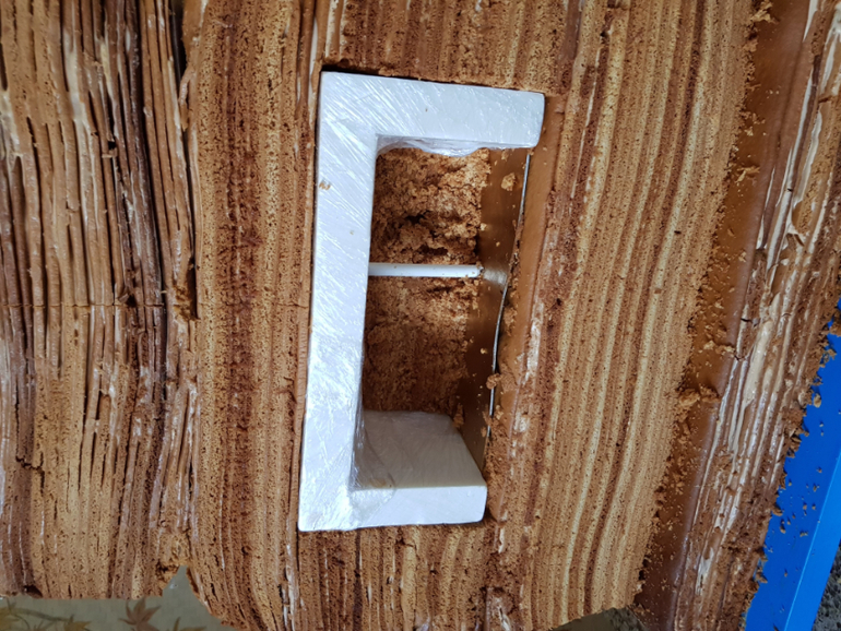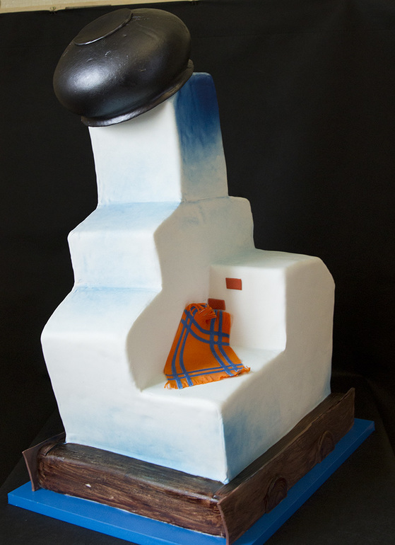 Внутри торта по всей высоте изделия проходит стальной штифт, который изолирован от съедобной части. А внутри самой печки 6 ярусов. Каждый ярус укреплен, что делает всю конструкцию очень устойчивой. Потом вырезала рот из пенаплекса и обтянула пищевой пленкой, вставила в торт. Вырезала лежанку, сделала трубу с наклоном и края подправила, как виделось.