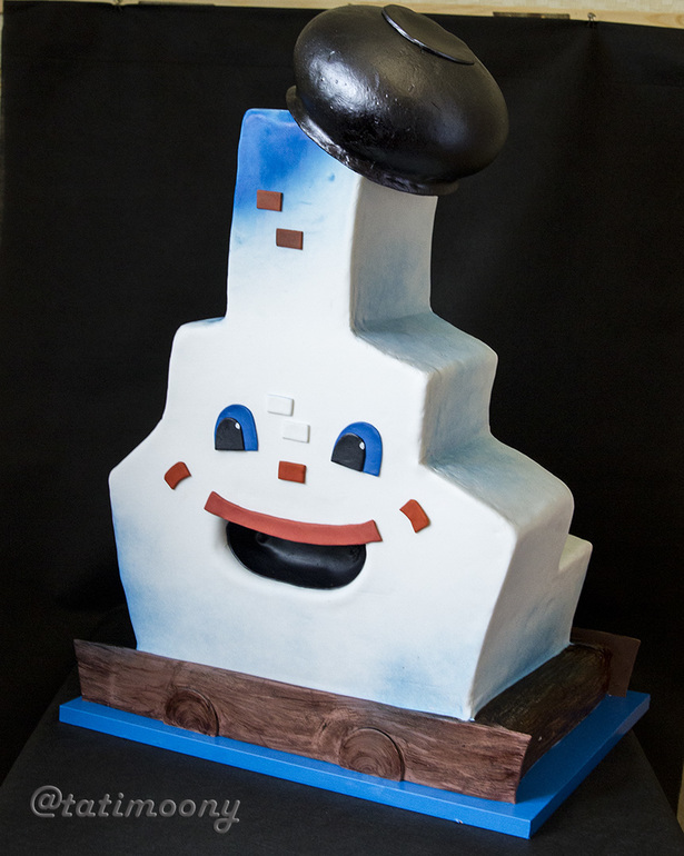 После обтяжки все пошла намного быстрее, вырезать рот, глаза, плед и оттенить аэрографом потребовало меньше всего сил и времени. К 15 часам в пт торт был готов! Вес составил 22 кг, высота с горшком 75 см.