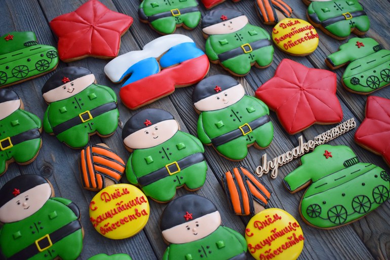ПряникиЦелая армия солдатиков💂, а ещё медали, звёзды, танки, цифры, бабочка+рубашка+усы, пиво с рыбкой и т.д..🎖️и это ещё не всё 🙈..