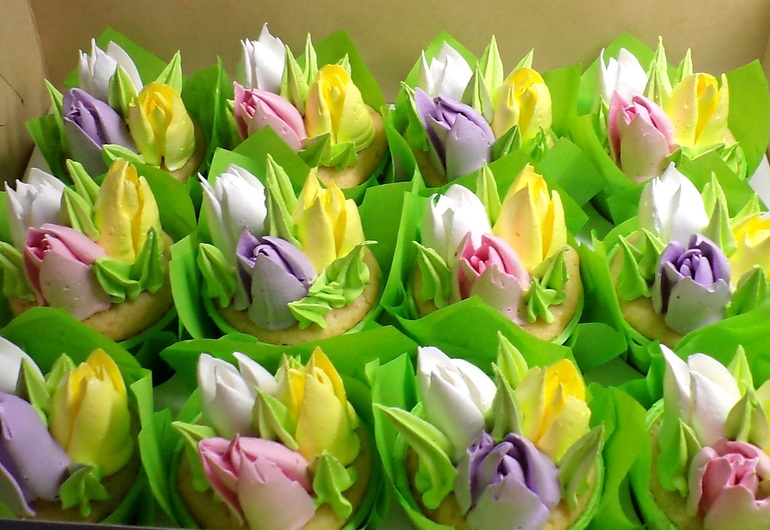 Капкейки и КейкпопсыНачинаются тюльпанные дни. (Ванильные с апельсиновым курдом, тюльпаны - белковый заварной)
