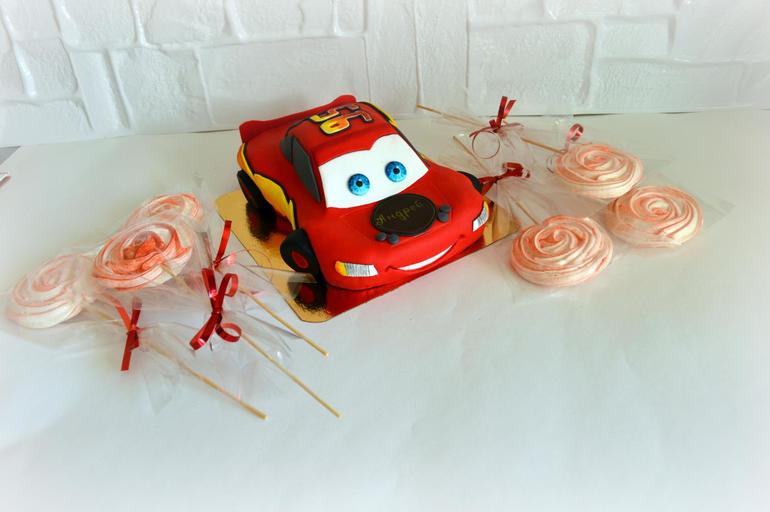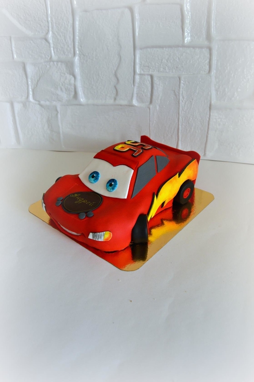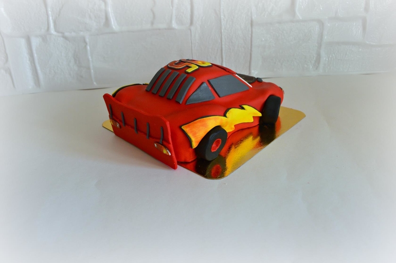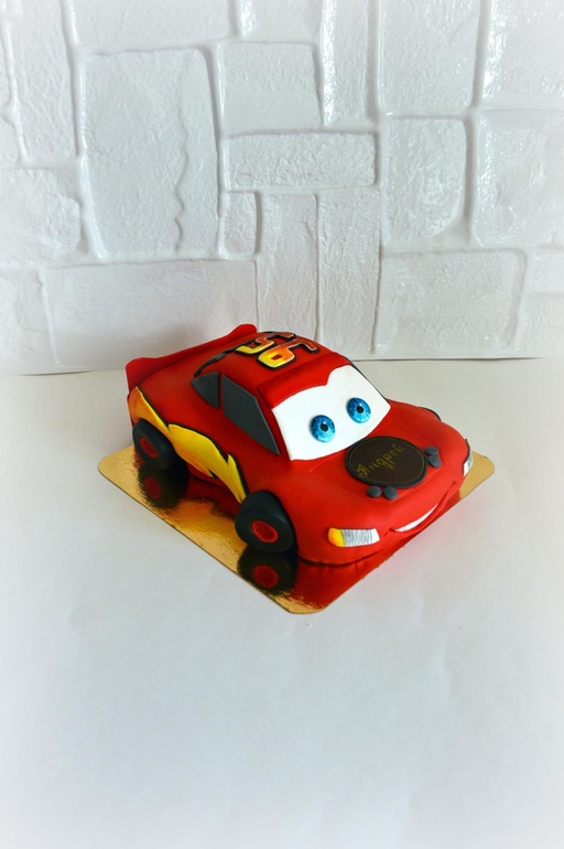 Данный макквинчик весом 1500 г. На создание 3Д тортов, конечно, затрачивается больше времени, нежели на традиционные круглые торты, но зато сколько радости в глазах у именинника и его гостей при виде такой машинки!