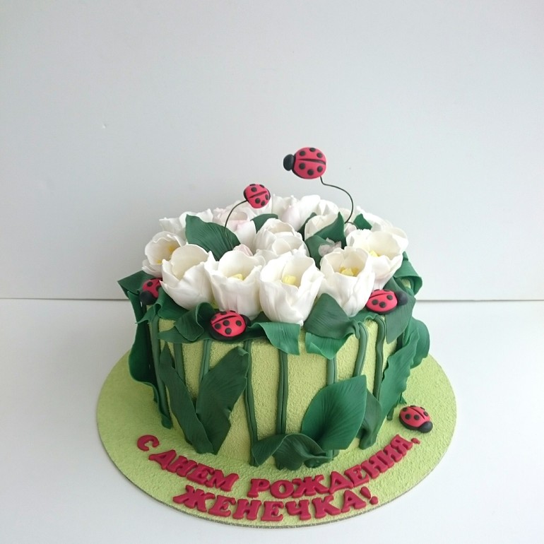 Украшение тортов кремом,шоколадом, фруктамиИдея не моя, причём, судя по всему, многие делали такой торт. Сделала этот торт без мастичного покрытия, в шоколадном велюре. И почти 20 тюльпанов! Со всеми пестиками-тычинками, как полагается)