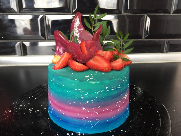 Такой неординарный цвет делала впервые, впервые работала с изомальтом. Торт ночь постоял с декором в холодильнике, изомальт слегка "поплыл". Делала чисто для себя, для души :)