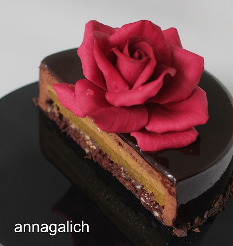 Внутри: шоколадный бисквит с фундуком, фундучный хрустящий слой, конфи из апельсина и маракуйи, карамельный крем, шоколадный мусс. Покрытие - шоколадный гляссаж.