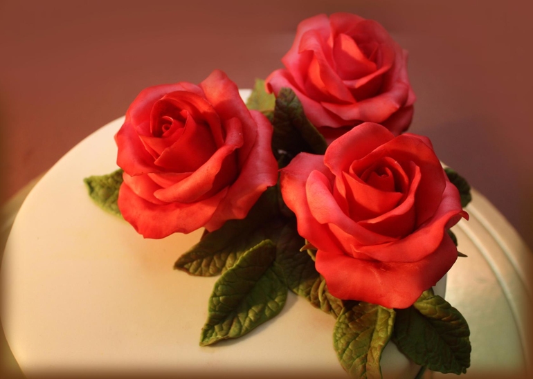 Вик, из принцессы отлично роза лепится,просто лепестки не надо сильно раскатывать у основания, только края тонкие, тогда они держатся отлично.. Я всегда из нее лепила,очень быстро и удобно, без заморочек, а сейчас из шоколадной также отлично. Вот эти красные из принцесски..