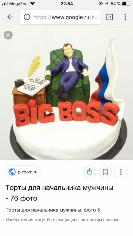 Да, у тебя каждый торт с историей. Вот в данном случае не знаю, что и сказать. Кроме того, что фигурка то классная получилась, жаль, что жмоты таки не скинулись, видимо босса любят, но не настолько, чтобы свои кровные(хоть и 100р) тратить на него. Знаешь, я отнюдь не портретист, да что там портретист! Я даже фоторобот собственного ребенка навряд ли смогу составить! Но мне кажется, что босс хоть и похож, но ты его несколько "облагородила". У тебя он выглядит интеллигентнее, что ли. На фото - парниша из братков. Не знаю, может он чудесный человек, прекрасный семьянин, чуткий и справедливый руководитель, но вот глядя на его фото (особенно где он в банном халате - кажется, сзади сейчас выпрыгнут полуголые девицы) - крендель из 90-тых.