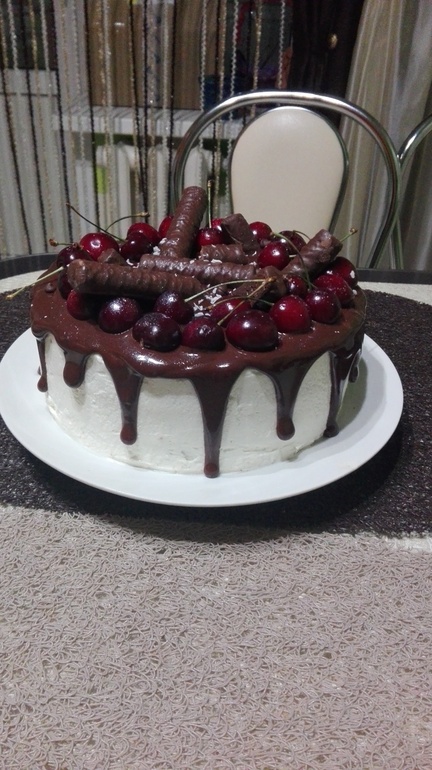 Коржи бисквит, между коржами сметанный крем с кусочками шоколада. Верхний корж бисквита сразу покрывала чизом на сливках