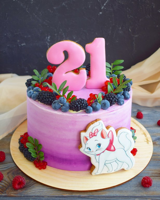 В сиренево-розовых оттенках👌, с веночком из свежих ягод и никакой мастики😊.. только имбирные пряники!