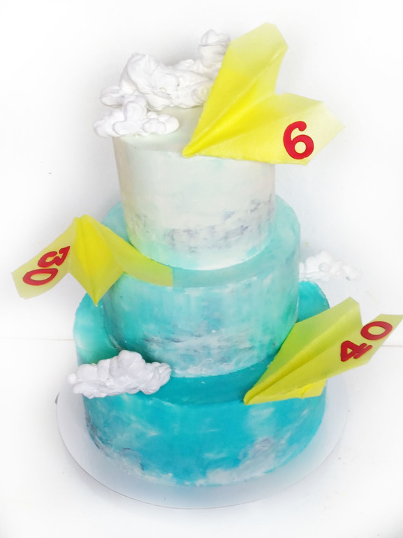 В поисках образа, объединяющего не только разные поколения, но и пол именинников родилась такая идея. Самолеты из вафельной бумаги)