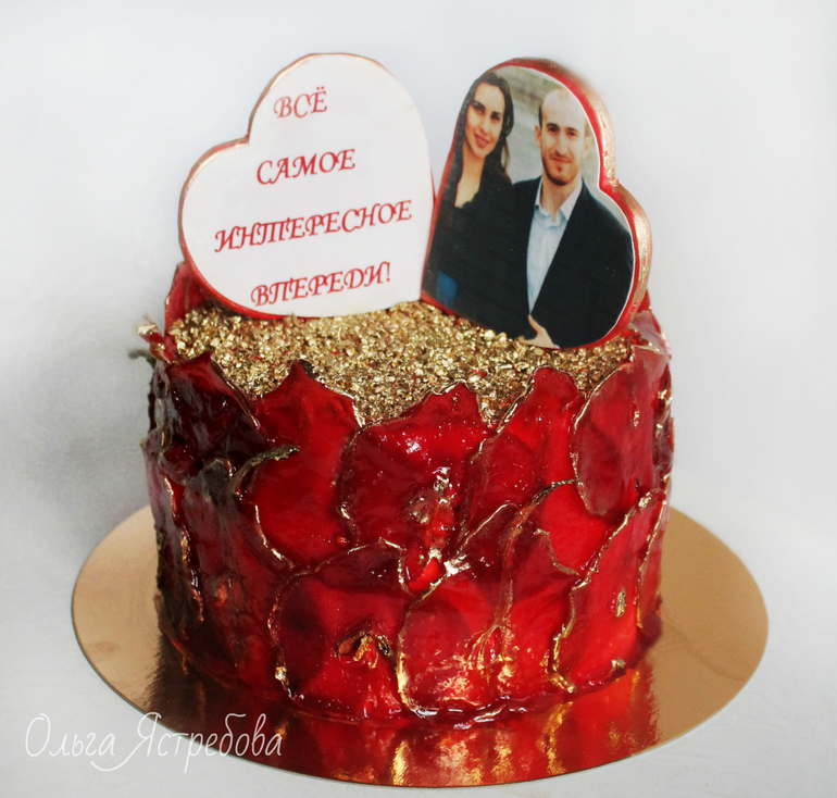 - а вот левая сторона медальончика-сердечка (ну или что это там.. я так просто вижу) удешевила образ грубоватым белым фоном и скучным (исключительно для меня.. ни коем образом не претендую на истину) надоевшим шрифтом.. в общем и целом (опять же для меня конкретно) печать (и правая и левая сторона) подпортили хороший торт.. если б у меня не было выбора и пришлось бы это делать, то я бы постаралась для начала очень высокого качества фотку вытрясти у клиента.. и второе - попыталась бы как-то "заламинировать" обе части сердца.. не знаю чем (может декоргелем, может изомальтом, иным), но попыталась бы, а то сам торт "лакированный", аж отсвечивает весь, а фотки в "медальоне" уныло матовые..