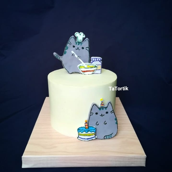 Украшение тортов кремом,шоколадом, фруктамиЧестно даже не знаю этого котика,что за герой,вероятней всего из мультика,хотя торт для девочки 14 лет .под катом торт до выравнивания кремом.и кстати,торт 18см диаметром 2,7 кг вышел.