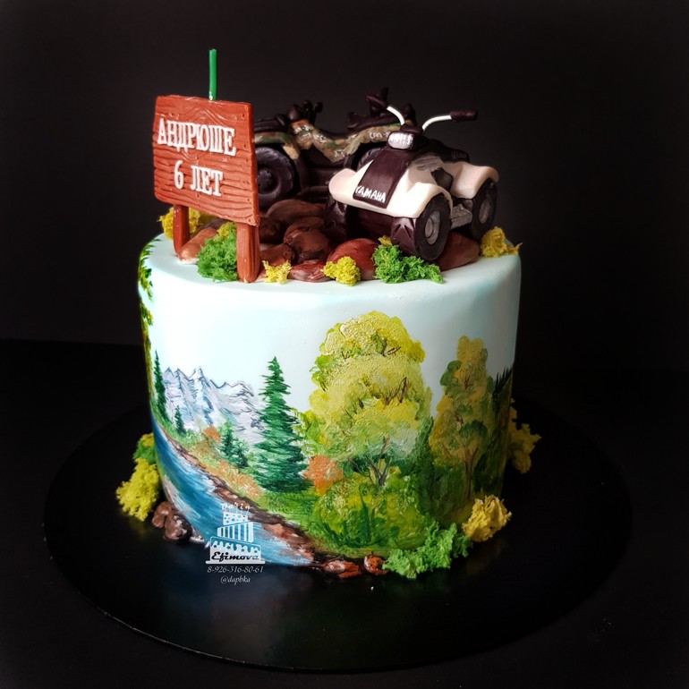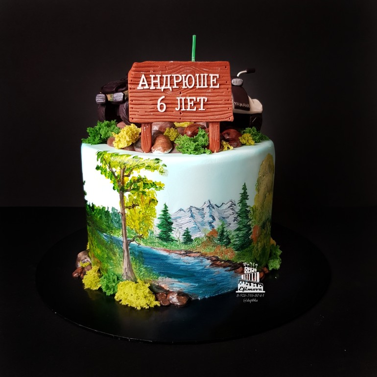 Неожиданно получился такой серьезный торт для шестилетнего Андрюши)) если дело доходит до пейзажей, не могу их сделать упрощенными, хоть тресни.. Все равно начинаю вырисовывать... И табличка, конечно ,не к месту, все загородила ...эх..) Торт получился панорамным))