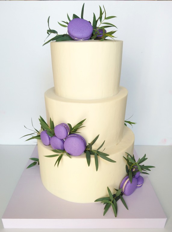 Торты свадебныеЛаконичный кремовый свадебный торт с макарон и зеленью. В цветах свадьбы. Внутри каждого яруса своя начинка.