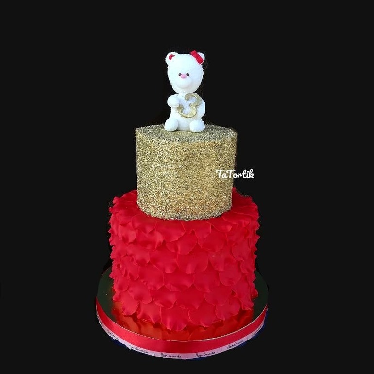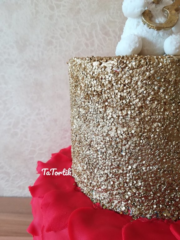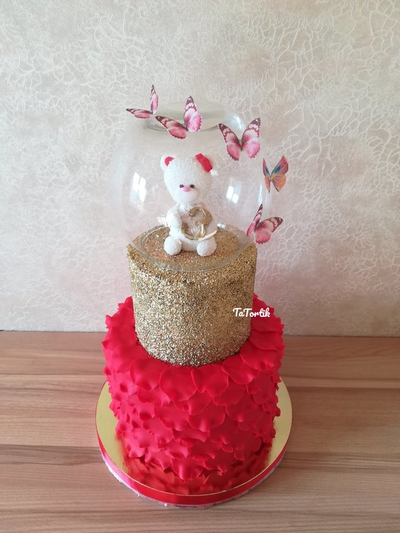 и просили такой шар сверху,хотя мне нравится без него,и вообще без мишки .торт сделан "под платье" маленькой именинницы- верх золотой в пайетках,низ красные рюши .