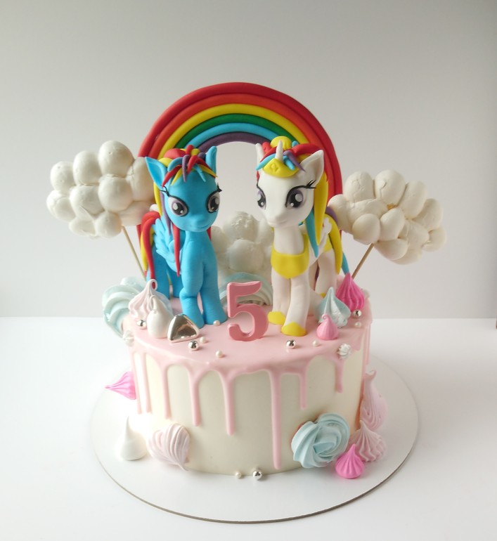 Небольшой торт для дочери моей коллеги на 5-летие. Внутри ванильный со сливочно-творожным кремом, вишней и безе.