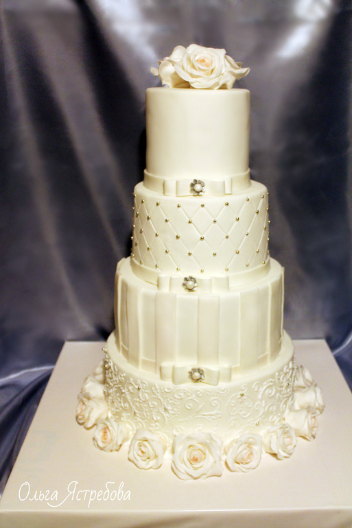 Полностью ручная работа, покрытие сахарной мастикой, розочки тоже из мастики, узор на нижнем ярусе айсингом.