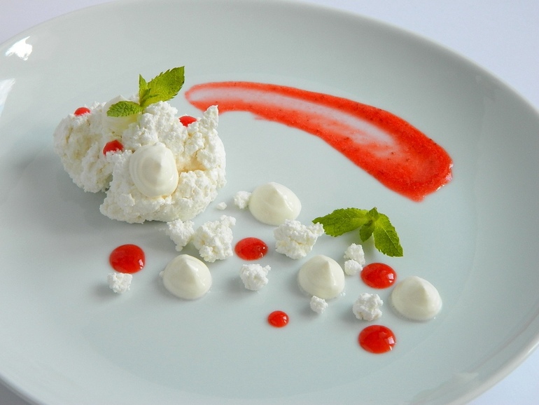 Творог в ресторанной подаче со сметанной и вареньем из клубники с маракуйей