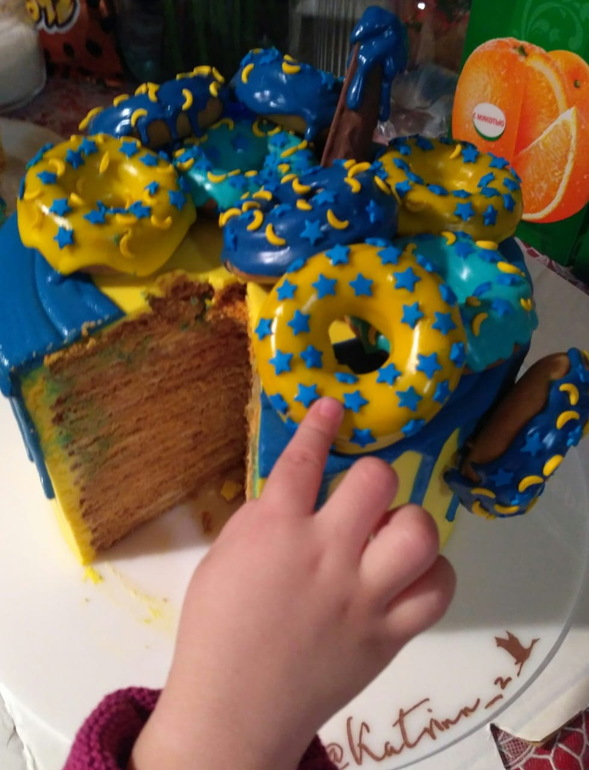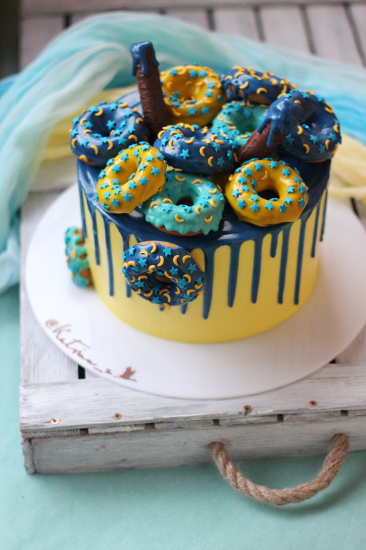 Украшение тортов кремом,шоколадом, фруктамиКарамельный медовик со сметанным кремом, 3 кг, очень осторожно отношусь к синему, но именинник хотел именно синюю глазурь)) в остальном же - просто со сладостями, в которых будут 2 палочки твикс, я предложила - пончики, форму как раз получила, они согласились