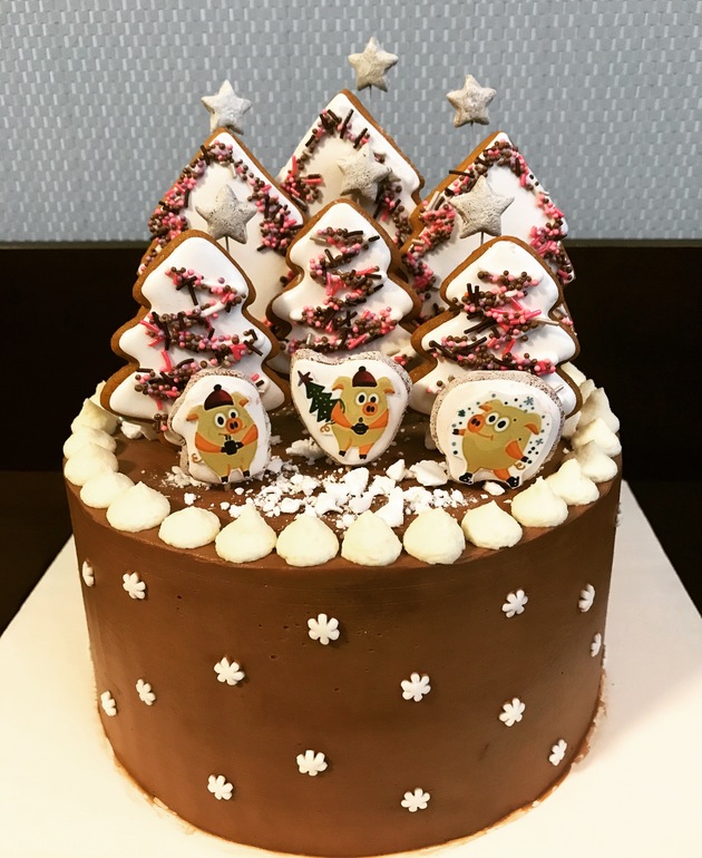 Внутри шоколадно-вишнёвый торт. Покрытие-шоколадный крем-чиз.
