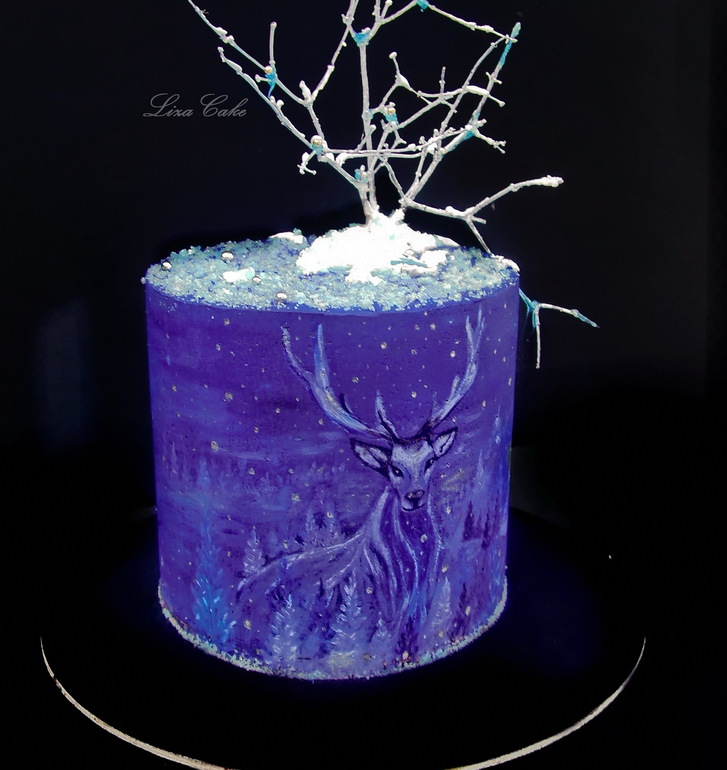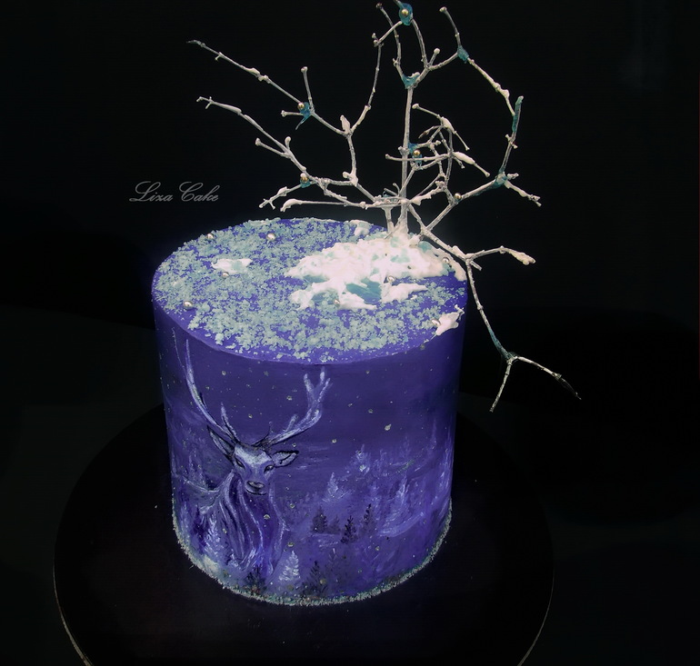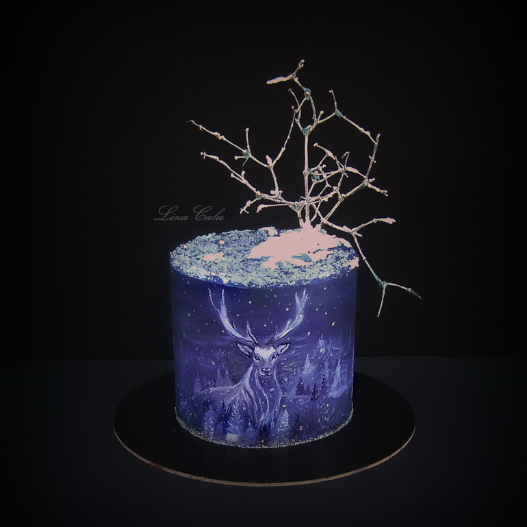 Торт кремовый, двух-ярусный. Роспись, как водится, ручная (или дикая.. я не всегда их различаю)).. и нет - ветка - это всего лишь ветка (крашеная диоксидом, укрепленная на айсинг.. ну и изомальт)