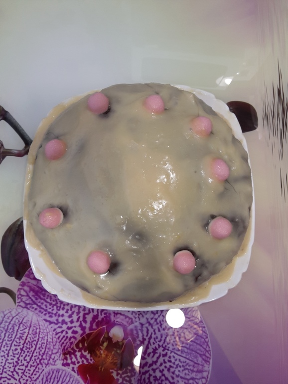 3.) Готовый остывший пирог разрезаем на 2 части и смазываем теплым кремом. Украшаем любыми кондитерскими украшениями.