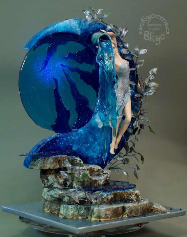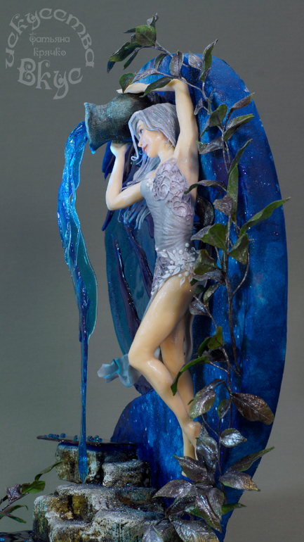 Оооооооо... Бесподобно! Даже не знаю чему больше внимания уделить : тут и анатомическая лепка, и роспись, и нежные кружева на платье, и растения почти живые, и вода течёт, - течёт!, - а не висит глыбой изомальта, и, наверняка, много ещё того, что я не вижу и не знаю по своей неопытности...