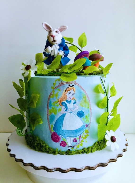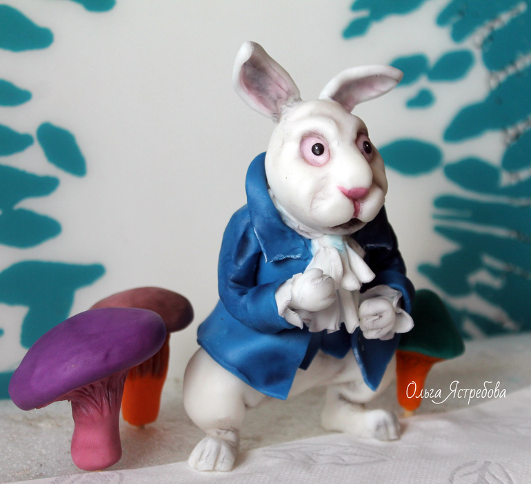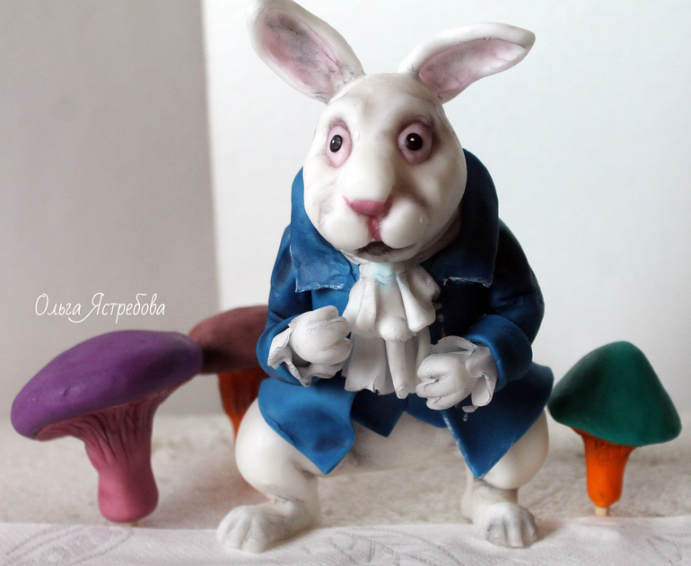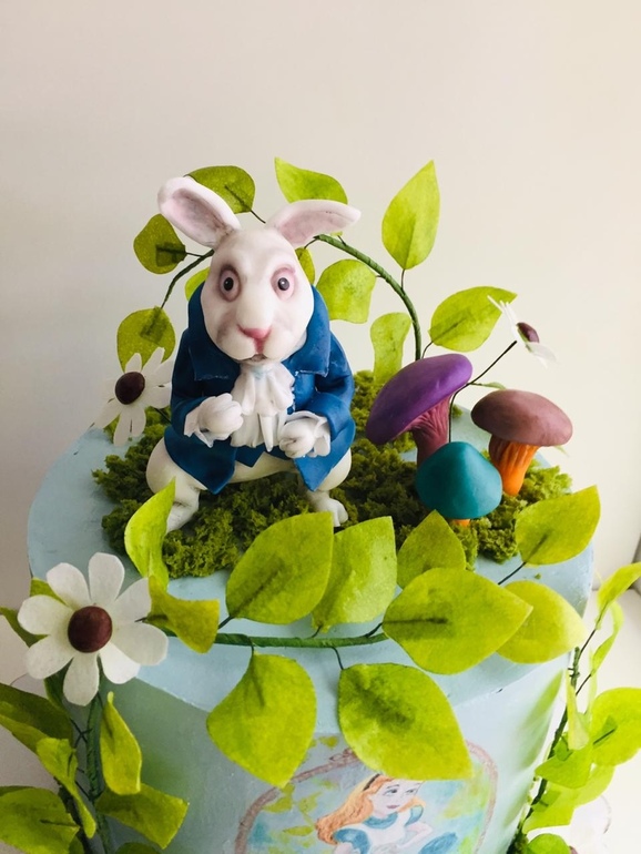 Кролик из сахарной мастики ,сделан по кадру из к/ф "Алиса в стране чудес". Заказали только фигурку, а на торте другой кондитер нарисовал Алису из мультика (фото ниже)