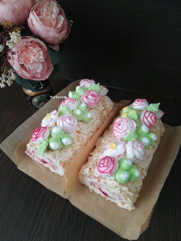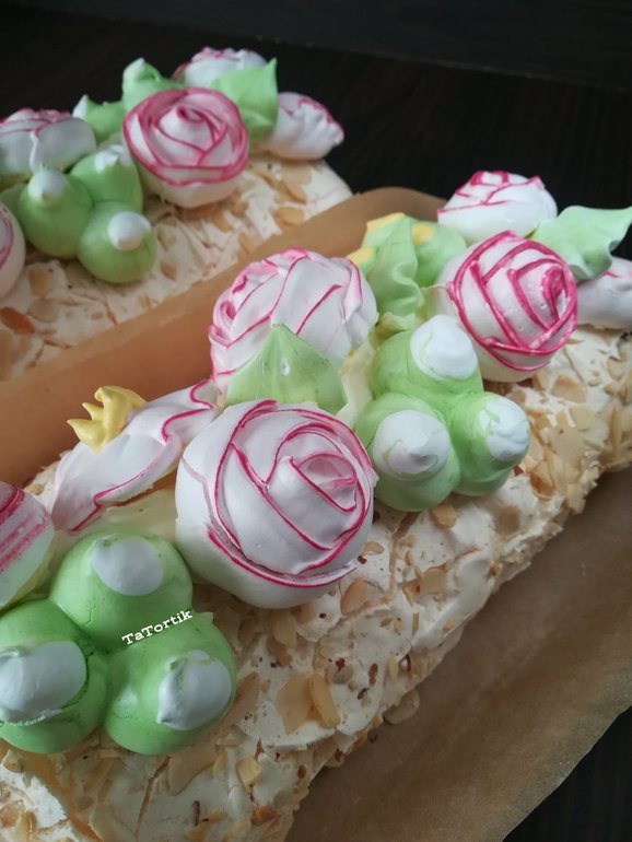 Меренговый рулет, внутри малиновое конфи. Весь декор это безе. Буду отрабатывать технику цветов. Надеюсь в следующий раз получится лучше. Под катом ещё фото