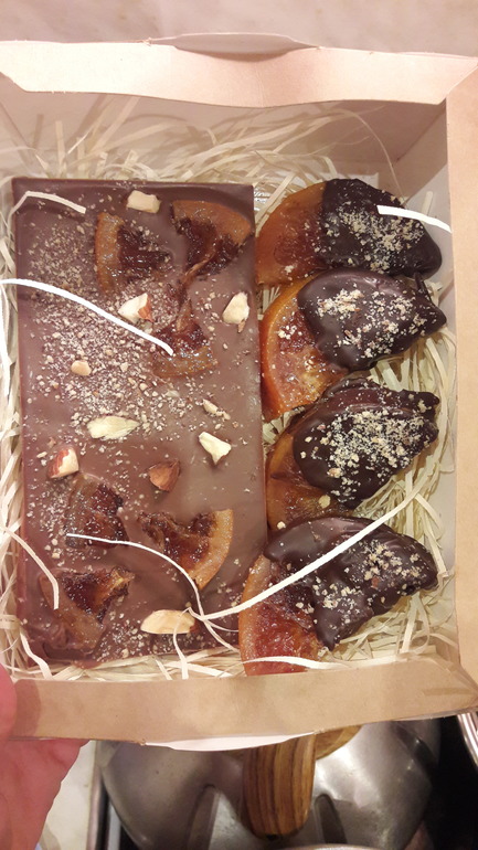 Шоколадный набор: Плитка молочного шоколада с апельсинами и орешками + карамелизированные апельсиновые дольки в шоколаде. Отличный презент к любому празднику. Цена набора - 300 р.