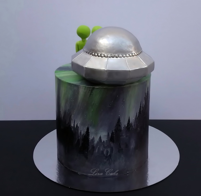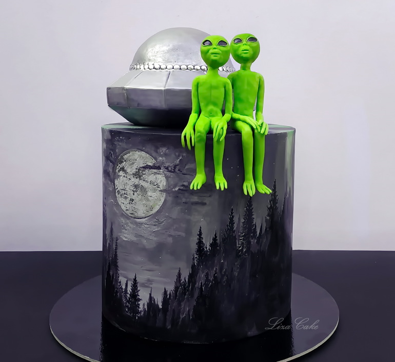 нуууу если у вас целый парк тарелок..до Марса не подбросите?))). а торт классный... борта с земными пейзажами-неземные.