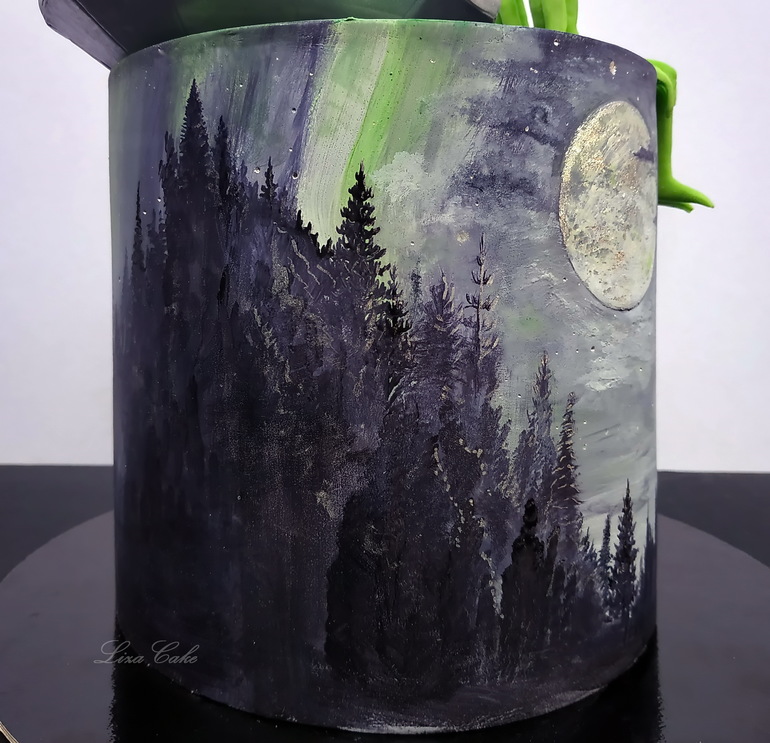 Торт был элементом МК по декору на инопланетную тему. "Спешите, количество мест цветов ограничено", а именно - черный, белый, неоновый зеленый и серебро. Реально тяжко с таким ограничением). У торта были очень тяжелые и затяжные роды - сменилось две тарелки).. в итоге вот..