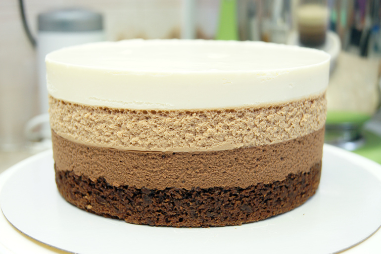 ...начинка Три шоколада с ликером Бейлиз (сочный шоколадный бисквит на темном шоколаде с добавлением ликера, 3 вида мусса на основе сливок, белого, молочного и темного бельгийского шоколада с добавлением ликера)