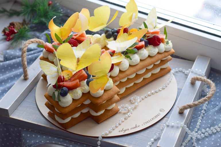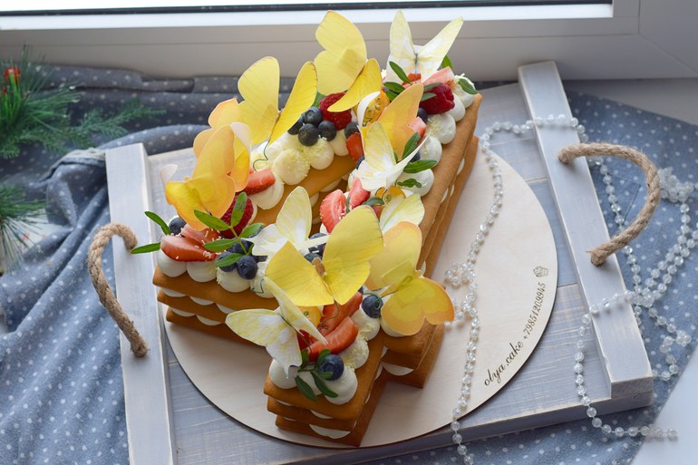 Медовые коржи, нежный сырно-сливочный крем 😋. Бабочки из вафельной бумаги. Под катом ещё фото.