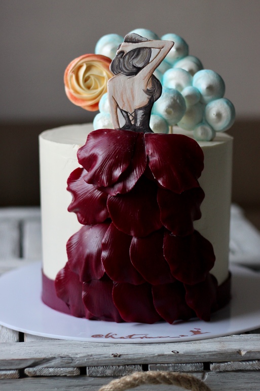 Девушка, солнце, облака....Три шоколада, 2,7 кг, высоковат 17см при D18 см, топпер (девушка) - рисунок по мастике, облака, солнце - безе, лепестки-платье - молочная мастика