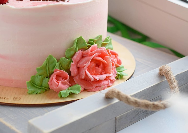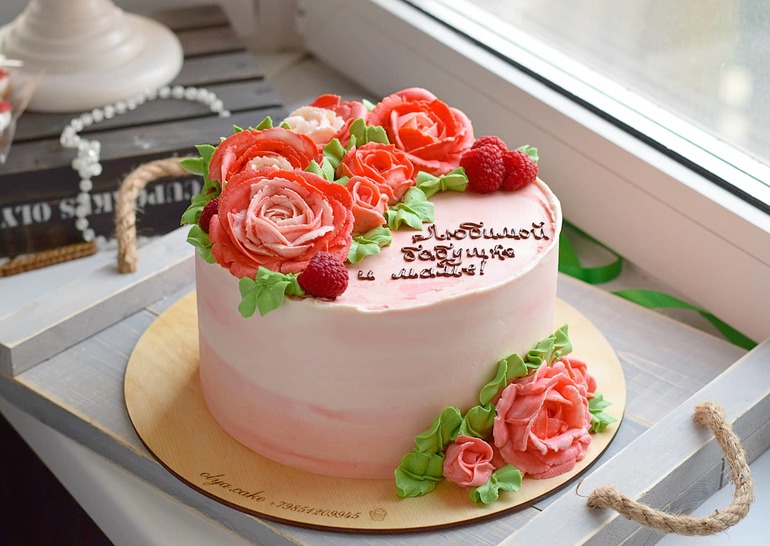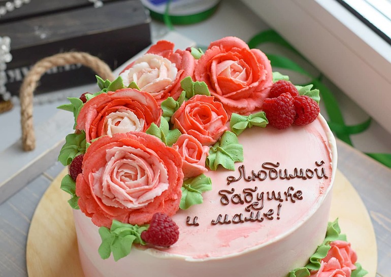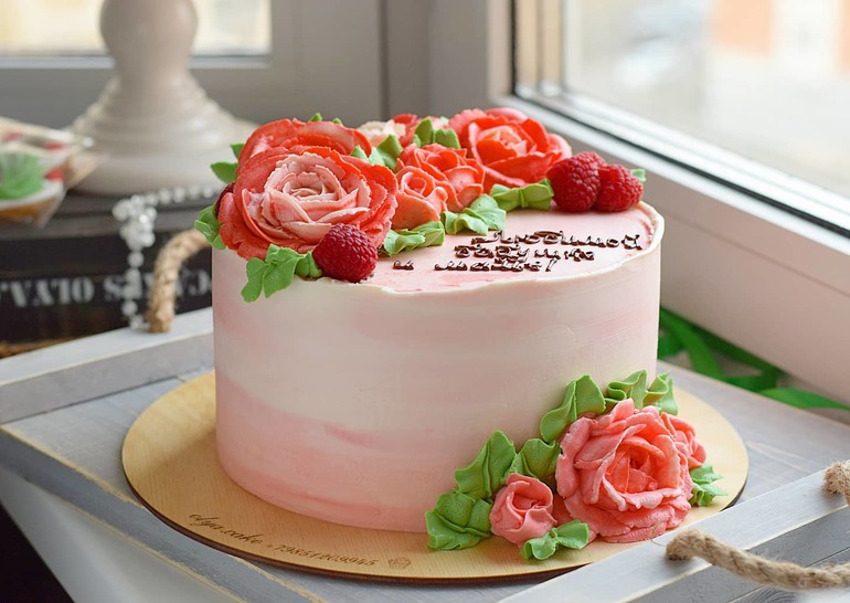 Украшение тортов кремом,шоколадом, фруктамиВнутри ванильный бисквит на горячем молоке, сырно-сливочный крем, малиновый соус и клубничный мусс.