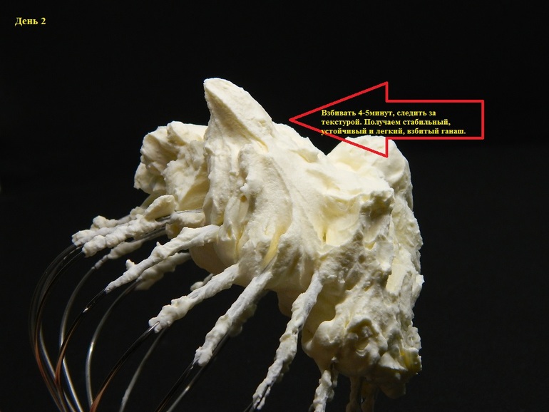 Ганаш стабилизировался и стал плотней. Но, в зависимости от рецепта, он может быть и жиже и плотнее. В случае, когда он плотней, выкладываем его в дежу миксера и начинаем на низкой скорости (на кенвуде 1) немного как бы разбивать его, он станет жиже, это нормально, и только после этого начинаем взбивать наш ганаш. НО исключительно на средней скорости, этот ганаш в отличии от сливок Шантильи взбивают только на средних скоростях, т.к. он очень легко перевзбивается. Я взбиваю на 4 скорости кенвуда, уйдет у вас на это 4-5 минут, НО время дано для того, чтобы легче вам было ориентироваться, может быть уйдет и меньше, поэтому не оставляем без присмотра наш ганаш, следим за меняющейся текстурой, лучше остановить немного раньше, чем перебить его.
