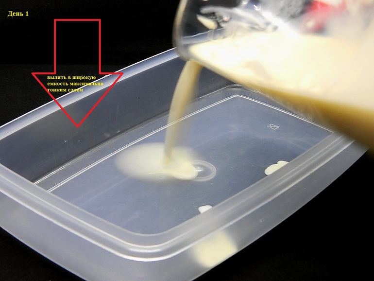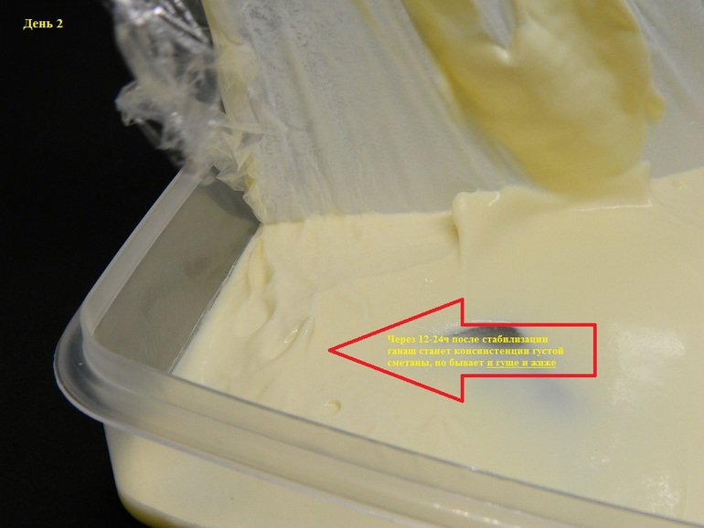 Переливаем его в максимально широкую тару, чтобы получить максимально тонкий слой. Таким образом наш ганаш стабилизируется лучше и быстрей.