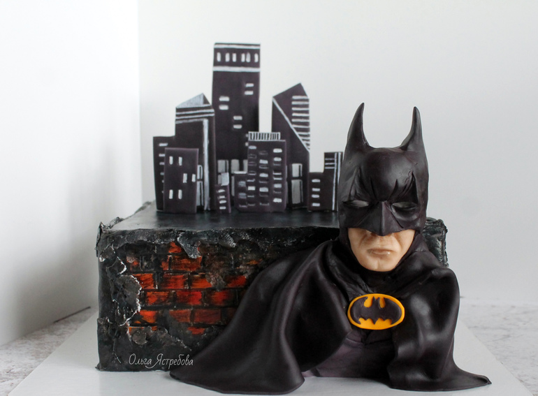 Покрытие сахарная мастика, ручная роспись пищевыми красителями, домики и фигура Бэтмэна тоже сахарная мастика ручная лепка.