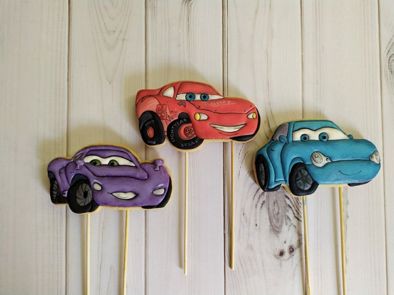 Если темнеет, то немного совсем. Делайте цвет глазури ну прям чуть светлее, чем нужно. вот я делала Тачки, правда это старые работы, ну и фото темноваты,