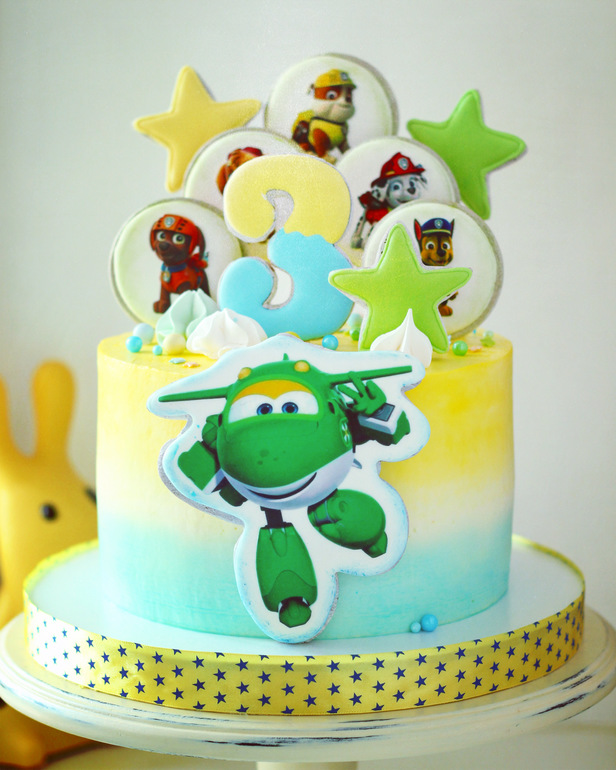 Надо было уместить героев Щенячего патруля и Суперкрылья в один торт🙈 Внутри «Йогуртовый» (ванильные коржи, клубничное конфи, йогуртовый мусс). Покрытие-крем-чиз. Декор-пряники.
