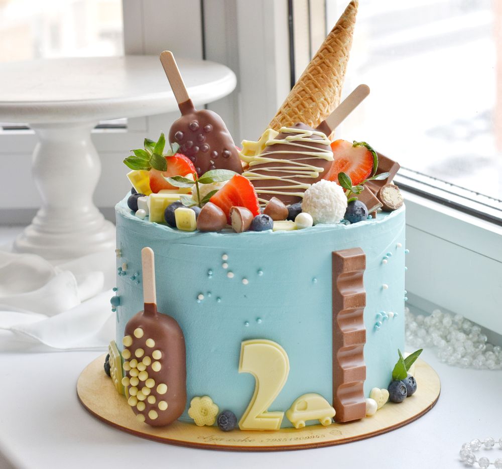 Украшение тортов кремом,шоколадом, фруктамиНа 2-х летие. Внутри клубничный 🍓 мусс, ванильный бисквит, сырно-сливочный крем с бельгийским шоколадом и малиновое кули