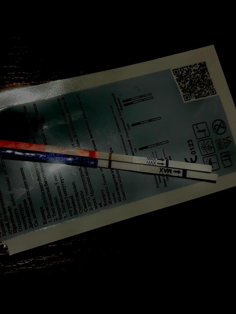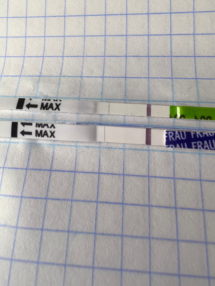 Сверху вчерашний Q-тест высохший, на свежем была тень. Сегодня фрау, чувствительность тоже 10, полоски видно, но они тонкие и не розовые. Так что скорее всего это реагент.