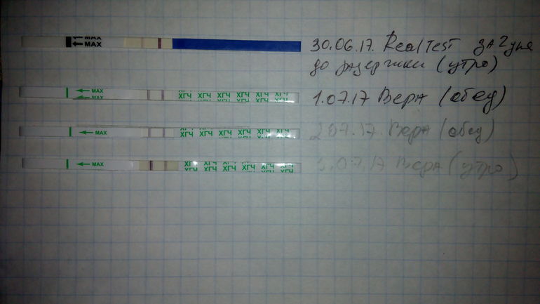 Ну очень яркая полоска в 4-ый день задержки, ярче контрольной. Тест Вера. Это значит, что ХГЧ капец как много?? Все полоски сухие...