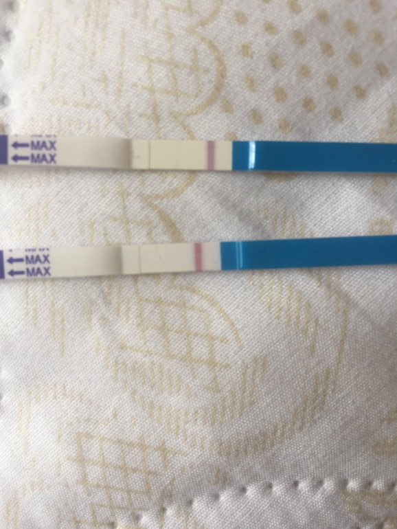 Не похоже на реагент...полосочка толстая.... я таких реагентов не видела.... в коментах прочитала что верхний утро, нижний вечер.... могла быть моча разбавленная сильно вечером, потому и не отреагировал... да и срок такой что еще уделаться можно тестами)))