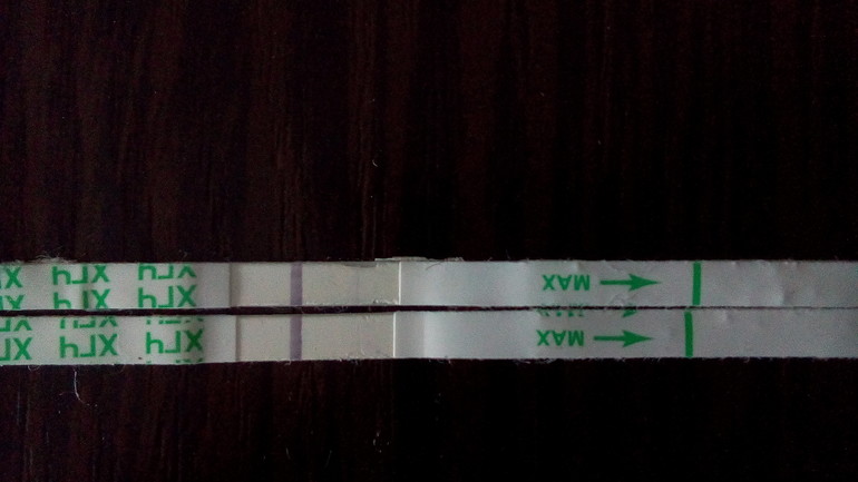Вот с прошлой беременности тест на 12 дпо, он сверху, сравнила с сегодняшним на 11 дпо , он снизу, брак видимо , полосочка дальше расположена, но розовая широкая