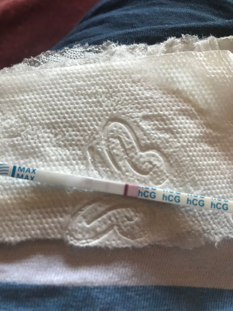 После задержки (указать день)Девочки 9 день задержки! 2 дня сильный стресс был плакала, вчера сильно болел бок где была овуля, сдала кровь жду результ, тест сделала ! Полоска слабая! Все это время были желтые выделения без запаха и зуда а щас увидела корич-роз! Что делать