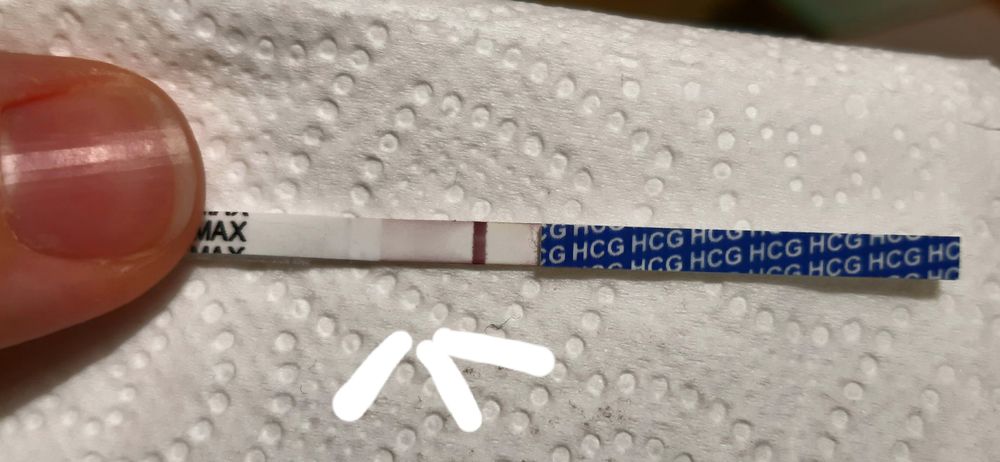 Сделайте другой тест, этот бракованный( Да и на нем не вижу, просто растекся реагент пятном.