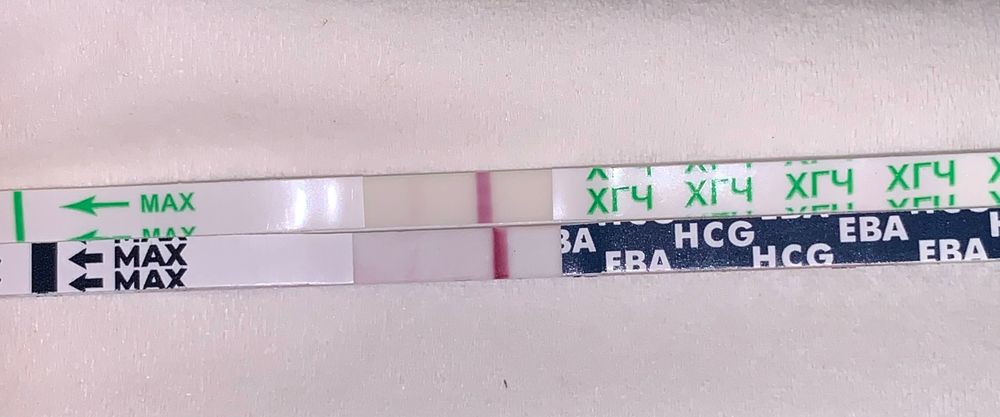 Привет девчонки, 9-10 дпо, делаю бишурс и Еву с одной порции, оба сразу выдают два полоски, не поверила, переделываю на эту же порцию те же тесты и пусто и там и там. Как так то? И смех и грех🤦🏼♀️