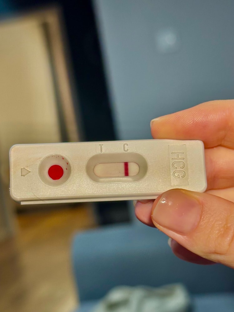 Сегодня 24 дц. 9 дпо наступил вечером (четко чувствовала овуляцию примерно в это же время во вторник). Утром тесты отрицательные. Это домашний тест, определяющий хгч в крови. Вообще у него чувствительность от 25, но у девочек он и меньшие концентрации определял, просто полоски бледные были. А еще я не сразу разобралась с пипеткой и добавила меньше крови, чем нужно было