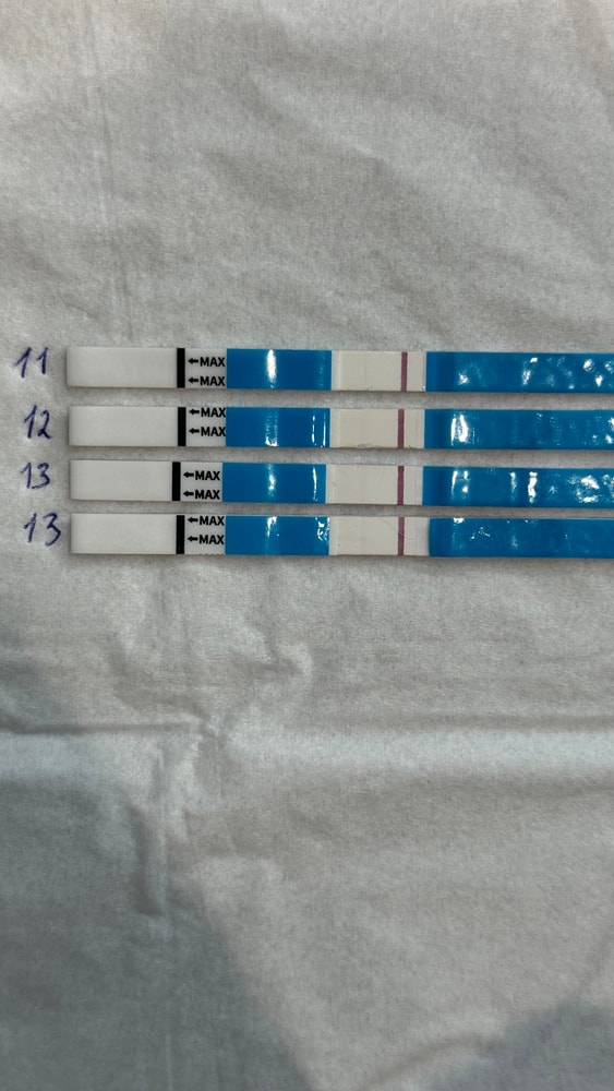 13 ДПОДевочки,помогите разобраться!🙏ровно год назад у меня была замершая и поэтому очень волнуюсь(( у меня обычно цикл 34-36 дней, прошлый месяц цикл был 30 дней, по календарю овуляция стоит на 27ноября и в эти дни был ПА. Появилась тошнота и чувствительность к запахам начала делать тесты примерно с 10дпо,была еле заметная тень,если прям очень присмотреться.сейчас вторую полоску видно лучше,но она по прежнему очень слабая,до месячных 2дня,а динамики по тестам особо нет😔 а сегодня уже и чувствую себя лучше,нет такой тошноты( очень переживаю или это не развивающая беременность или внематочная😩у кого так было,поделитесь пожалуйста опытом🙏 прикреплю фото,это тесты за вчера и сегодня и общее фото за 11-13дпо